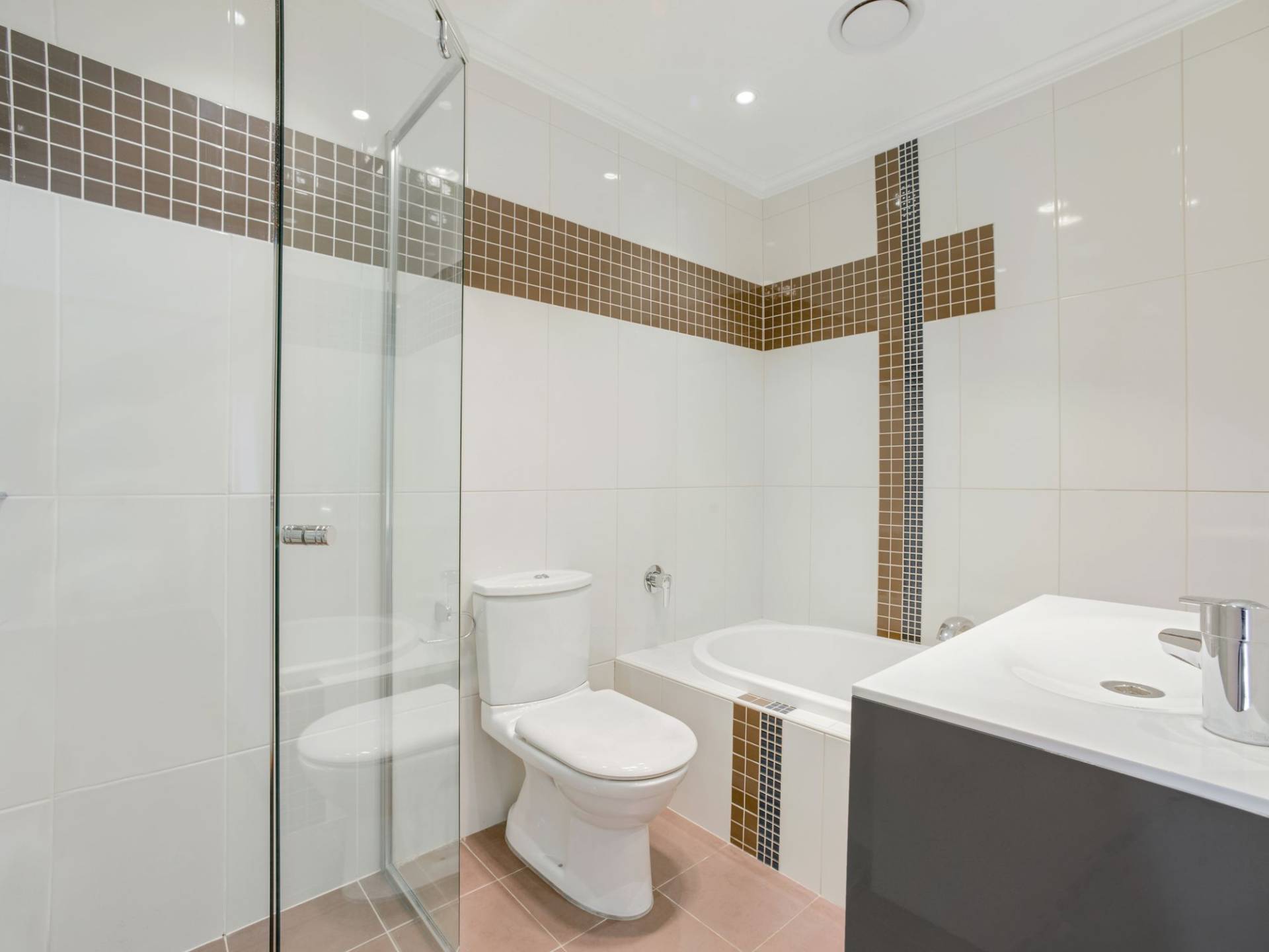 >  Sleek main bathroom shows off full tiling, air conditioning, intercom