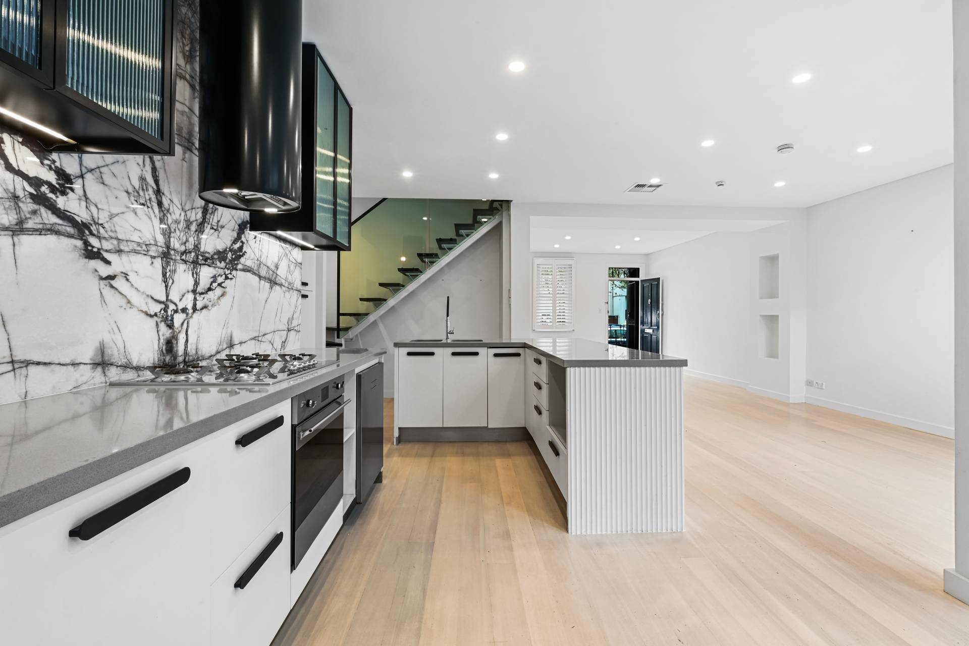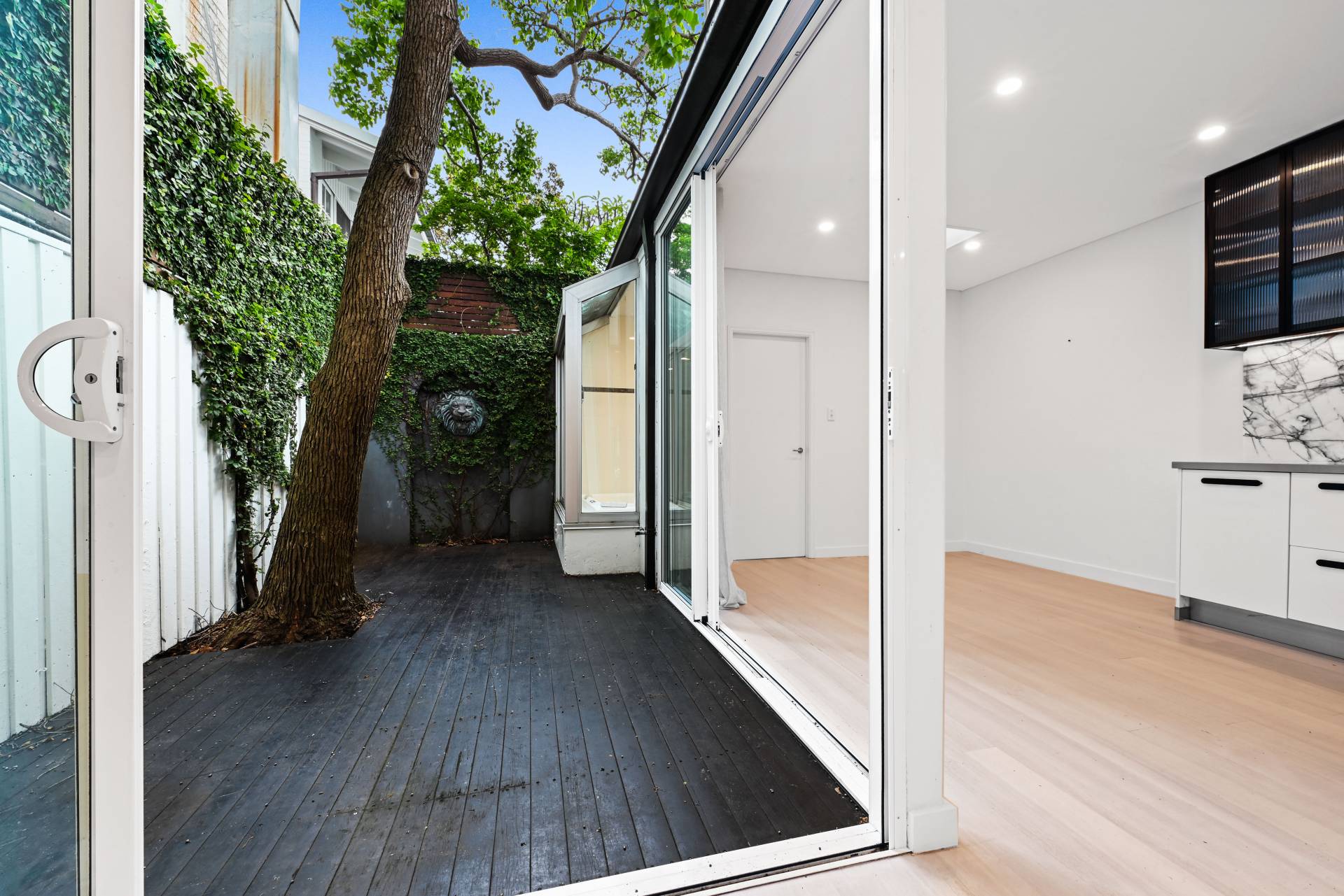 Deceptively spacious with a unique double-width layout hidden from the street, this cleverly designed two-level terrace opens up and surprises with two living areas, dining area seating 8 or more people, and a streamlined marble kitchen flowing to a private garden courtyard.