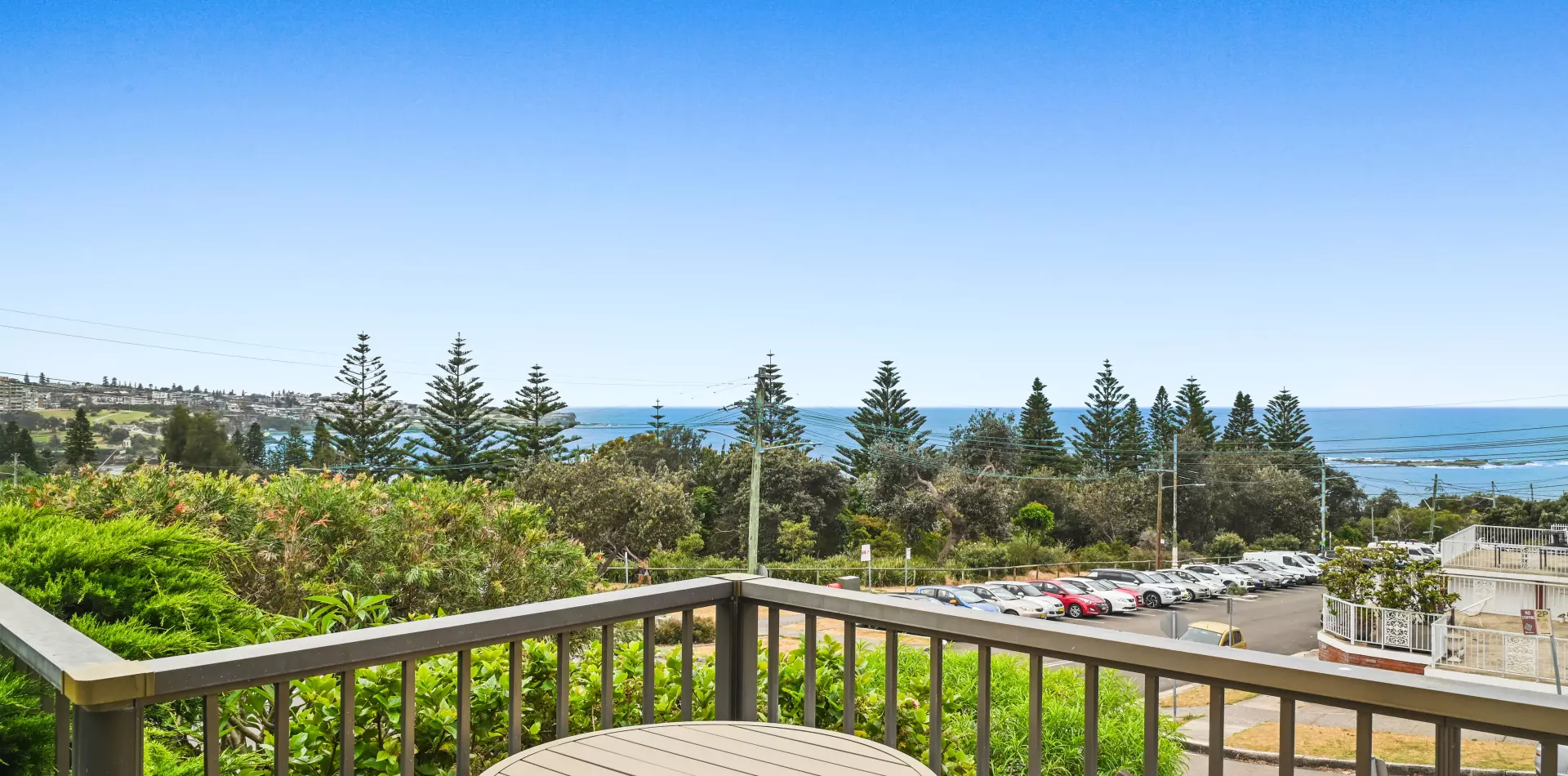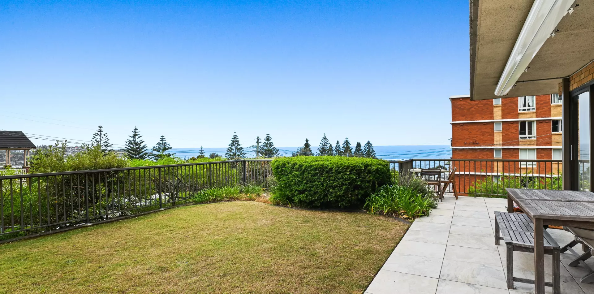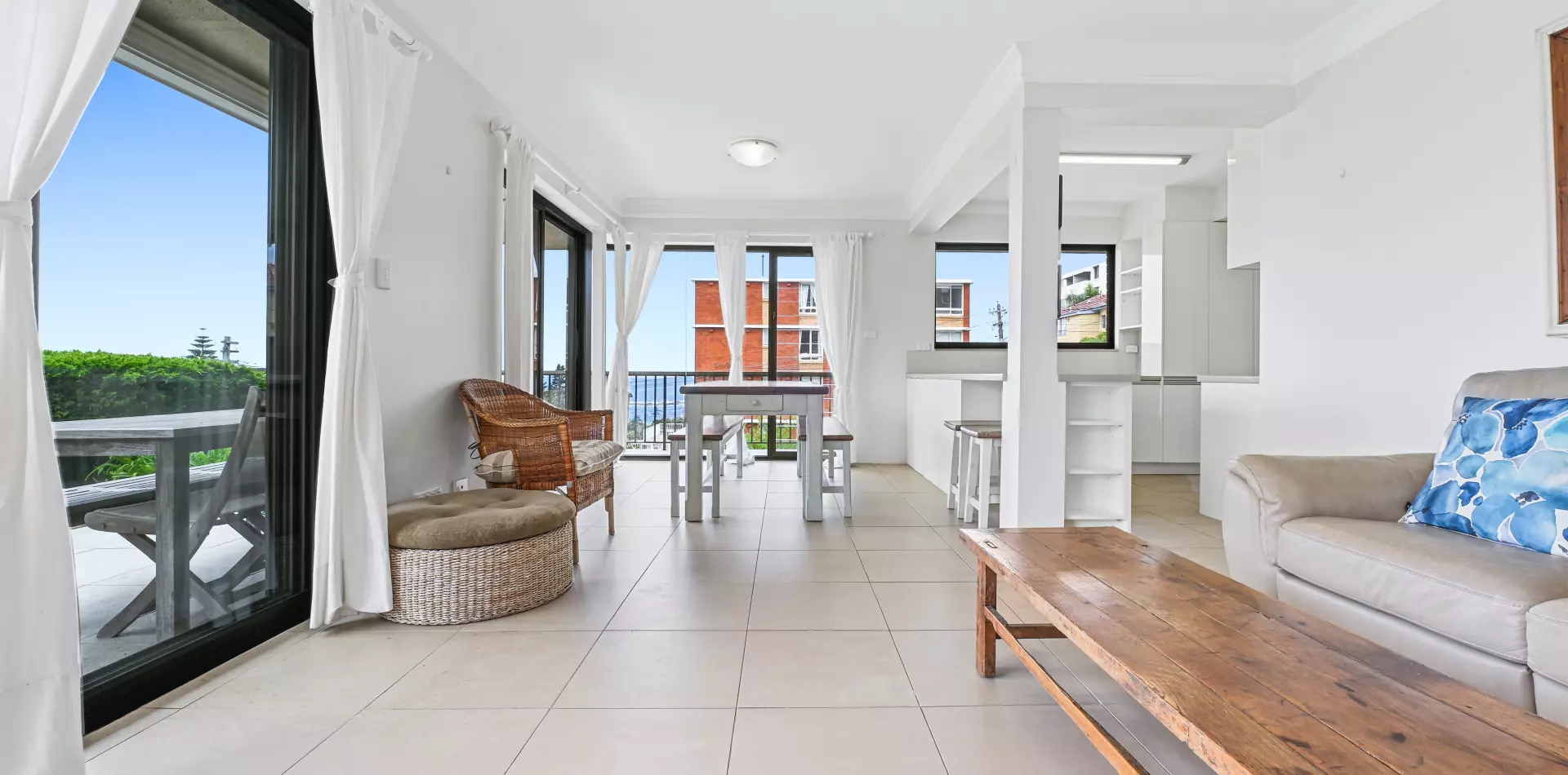 > Open-plan living and dining extends outdoors, views over Coogee Beach