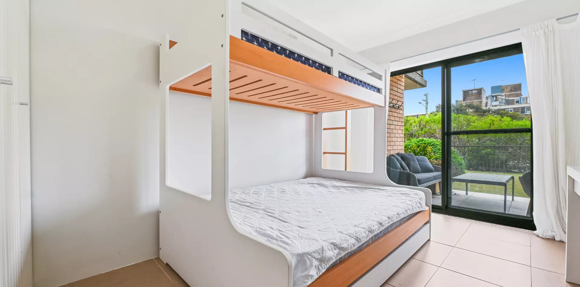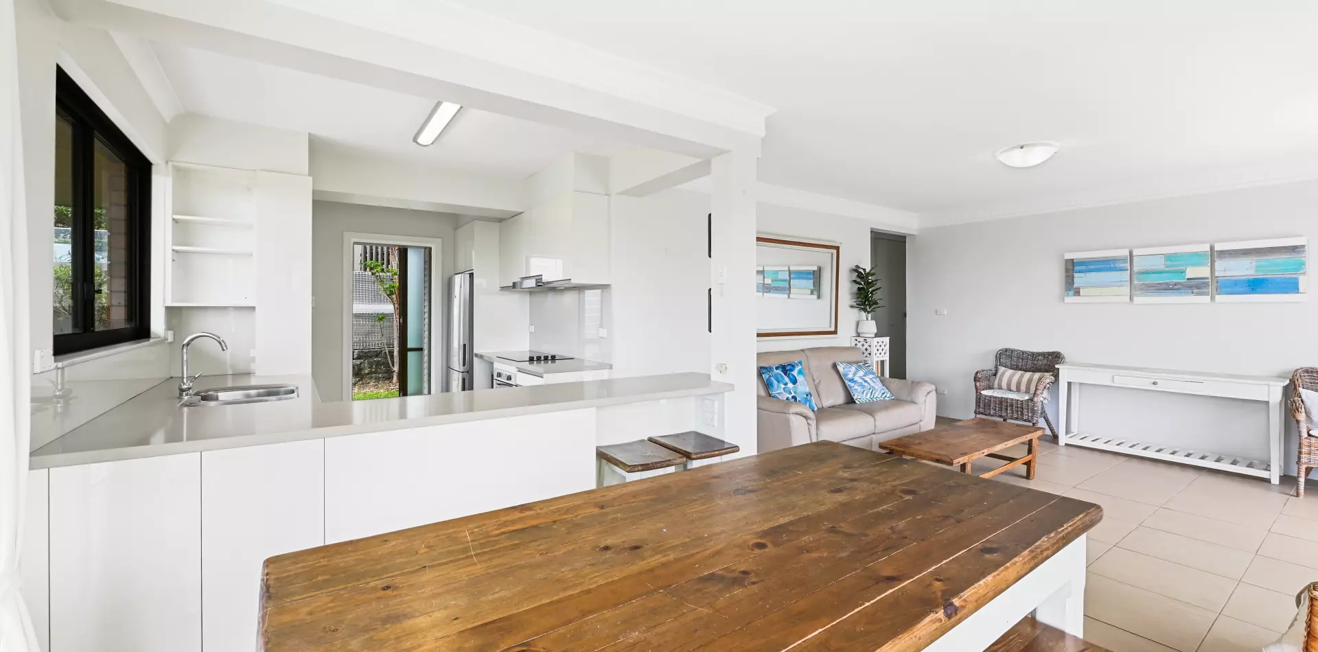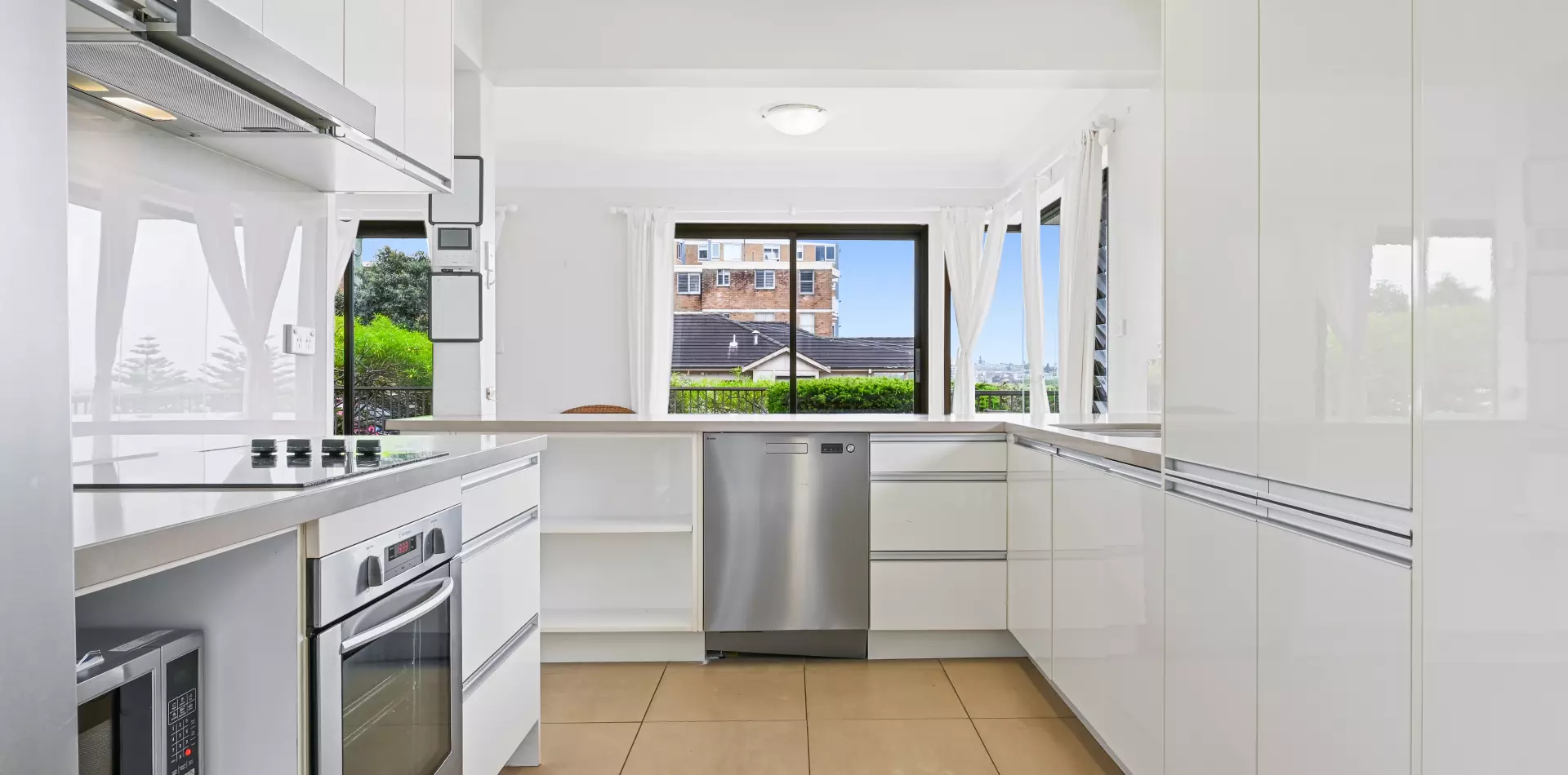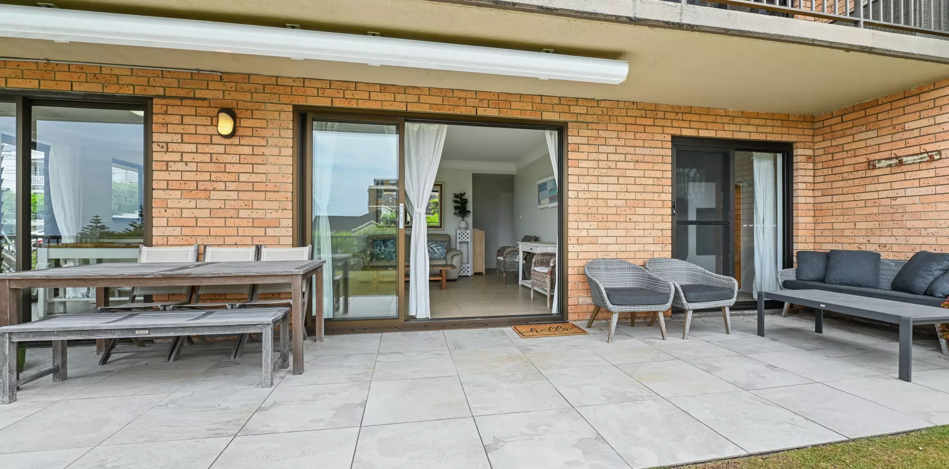 > Open-plan living and dining extends outdoors, views over Coogee Beach