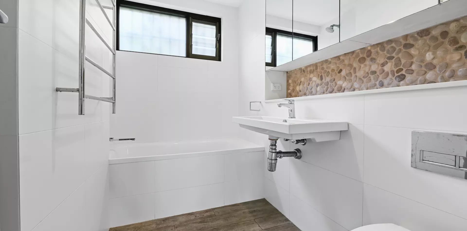 > Chic kitchen with stone bench top, dishwasher and internal laundry