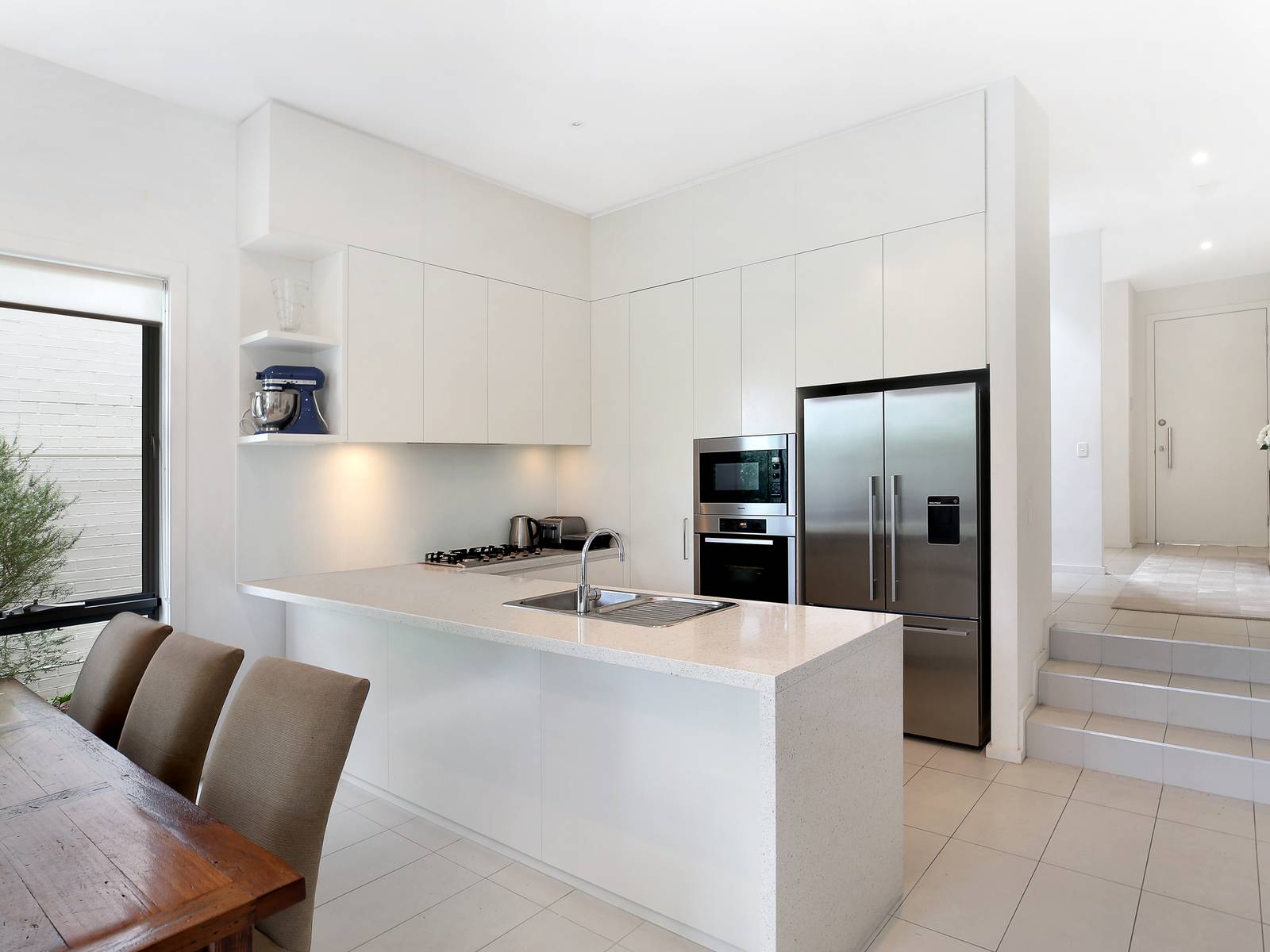 The elegant kitchen is an entertainer's dream and has the highest quality finishes: edge stone benches and glass splashbacks, Miele appliances and integrated sinks.