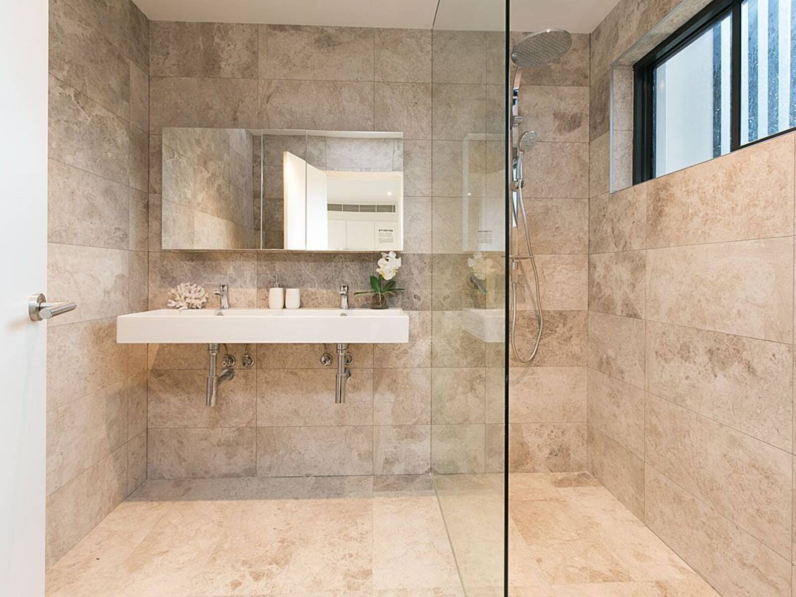 - Luxe heated bathrooms feature European natural stone