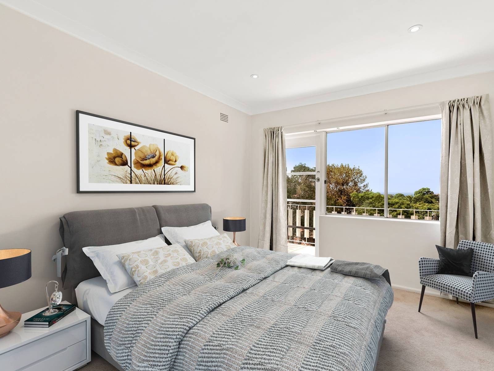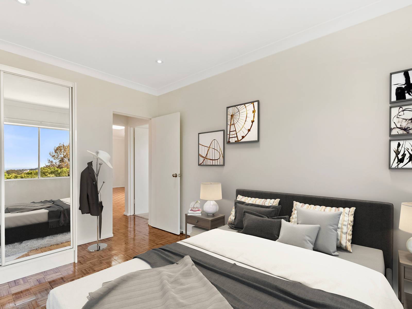 > Two double bedrooms with built-ins, main with East facing balcony and views