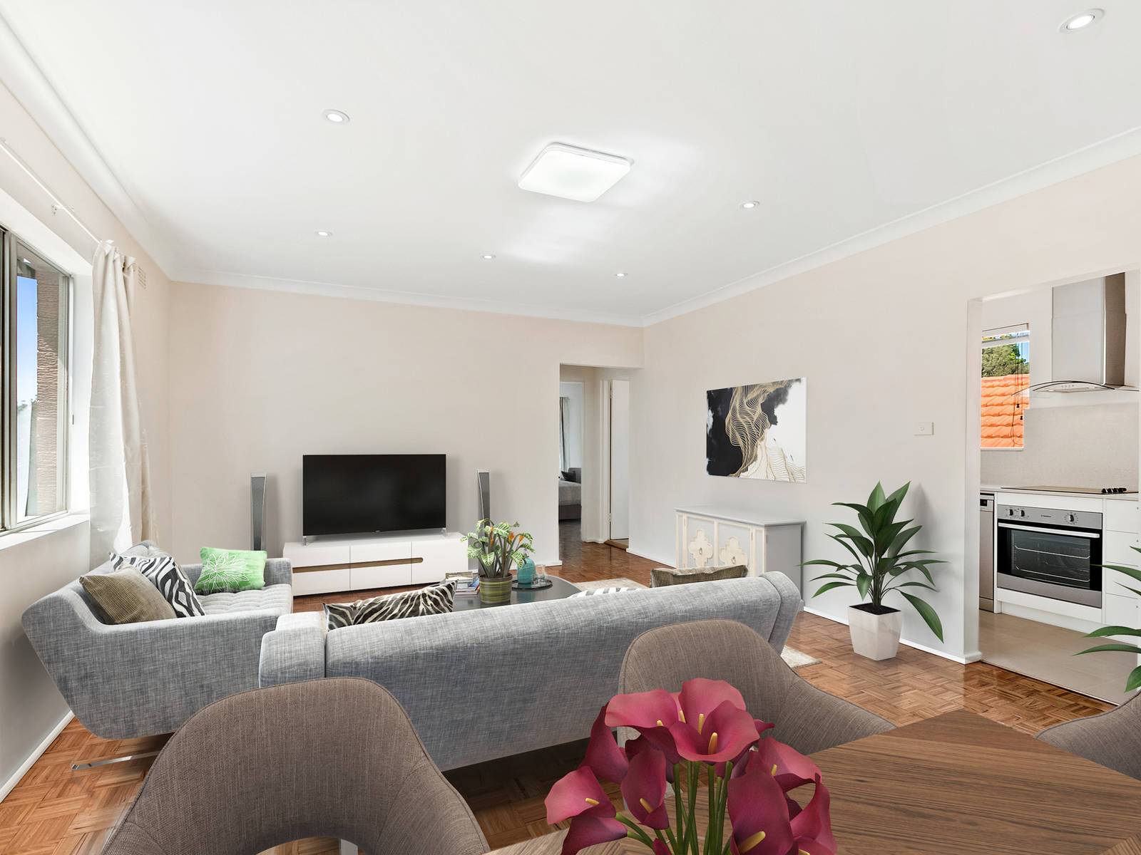 > Polished parquetry floors and downlights throughout, tiled bathroom and kitchen